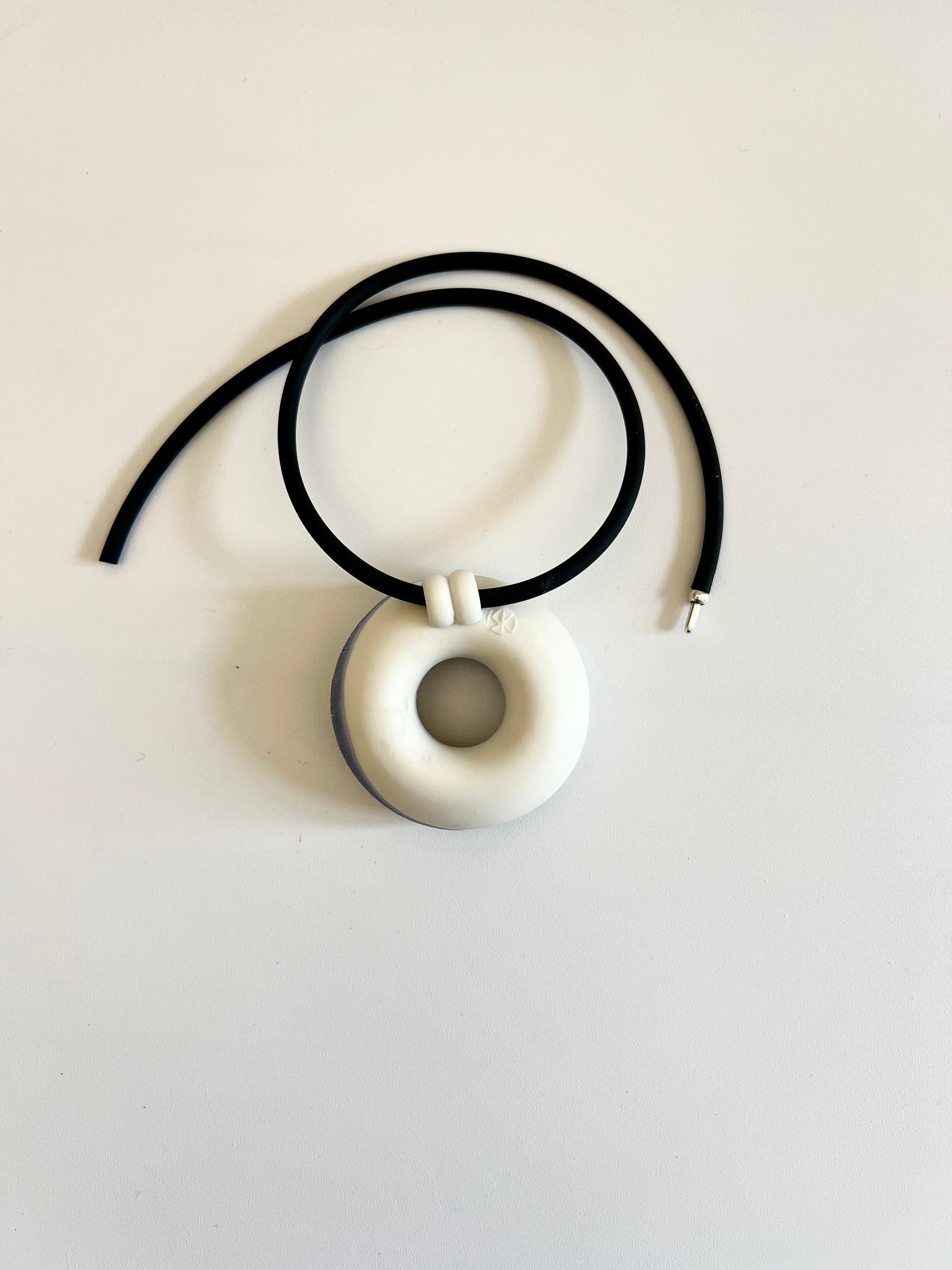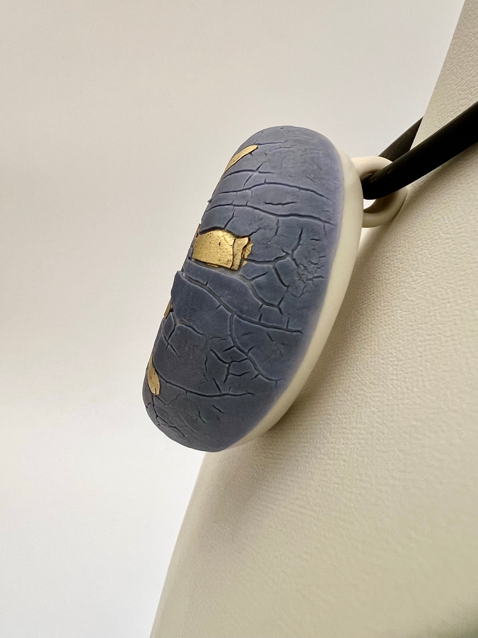 Each piece is wheel-thrown in porcelain and refined by hand. After a first firing, a glossy crawling glaze is applied, creating an intentionally irregular, tactile surface. The pendant is then high-fired to fix the glaze. Gold or platinum details are applied by hand and fixed through a third firing at 750°C.