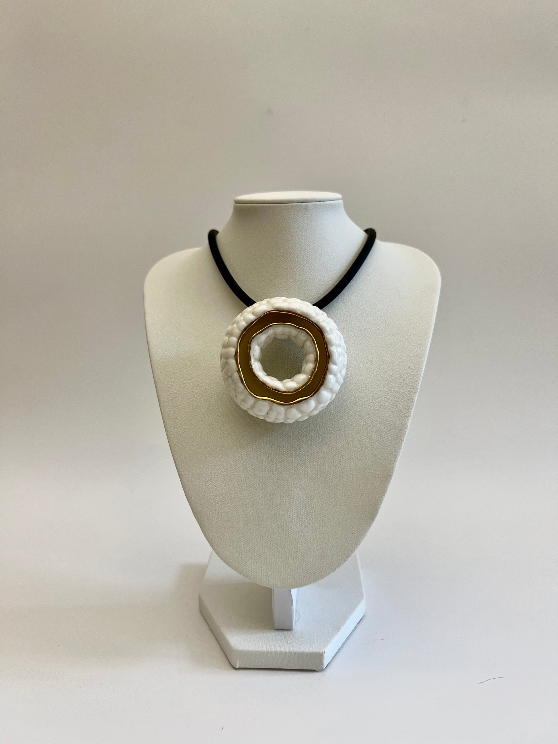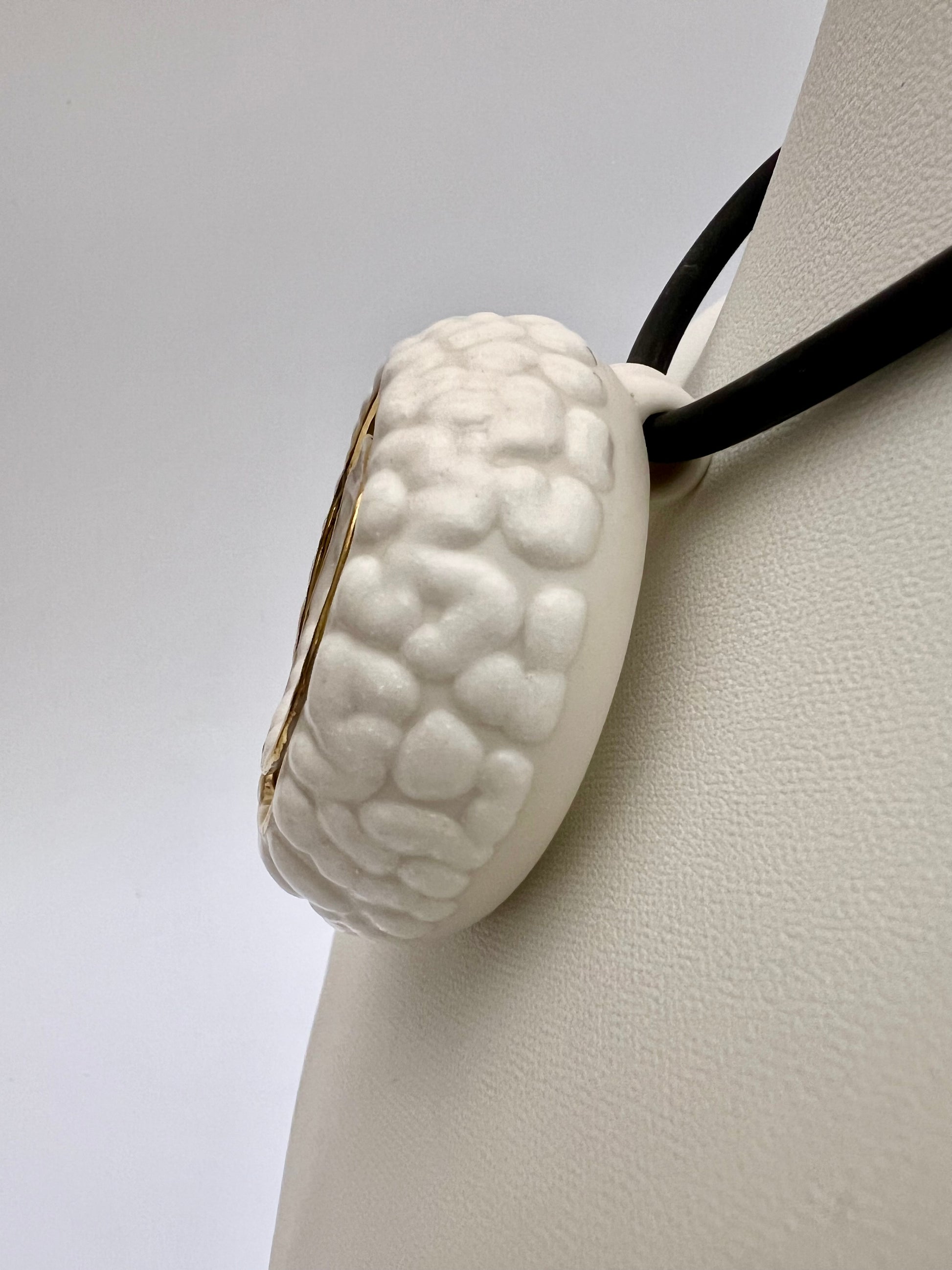 Each piece is wheel-thrown in porcelain and refined by hand. After a first firing, a glossy crawling glaze is applied, creating an intentionally irregular, tactile surface. The pendant is then high-fired to fix the glaze. Gold or platinum details are applied by hand and fixed through a third firing at 750°C.